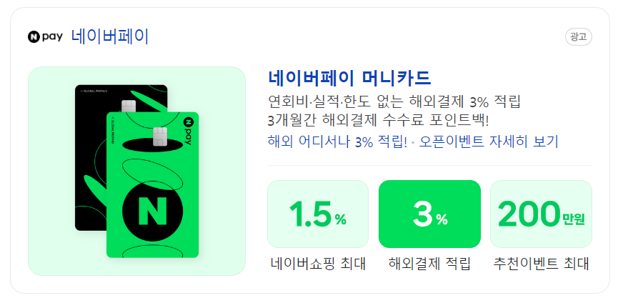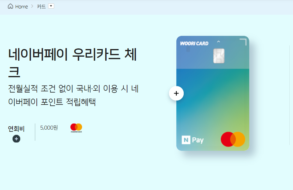 위 두 개의 네이버페이 카드와 달리 연회비가 5,000원이라는 단점이 있습니다. 단, 전월 실적 조건 없이 국내외 어디서나 1% 적립이 가능합니다.